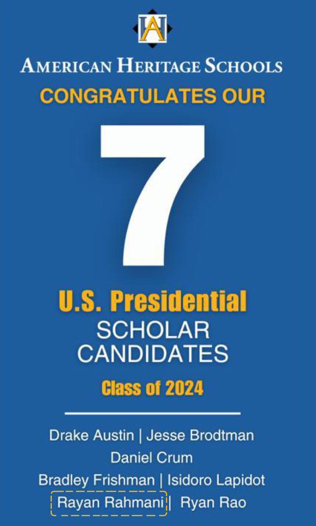 Graduated High School from American Heritage Delray Campus, Florida National Merit Scholar Presidential List Nominee